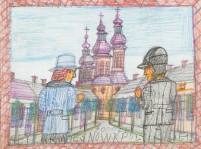 Dwie postacie przed kościołem (Nikifor z Banachem?)