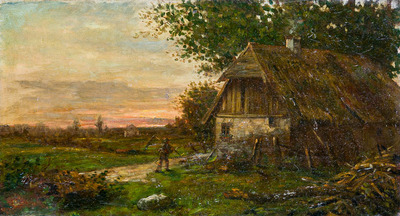 Bauernhütte und heimkehrender Landarbeiter mit Sense