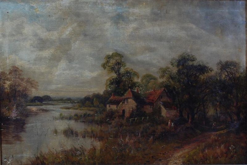 | Extensive rural landscape with figures before a riverbank cottage | |