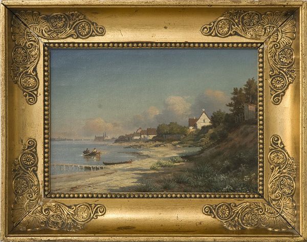 | Strandparti från norra Helsingör med Öresund, Kronborg och Kärnan i Helsingborg | |