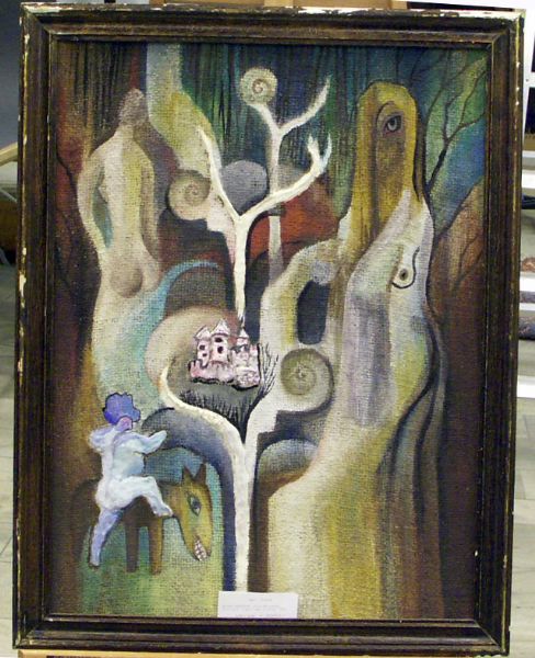 Surrealistiskt motiv av kvinnor, åsna och träd