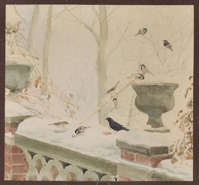 | Birds in a snowy garden with stone and brick balustrade and urns | |