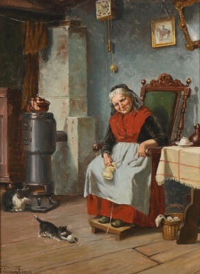 | Interior with old woman watching a kitten play with a ball of yarn | |