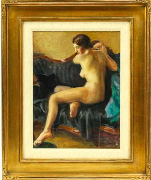 Female nude seated on a Victorian sofa