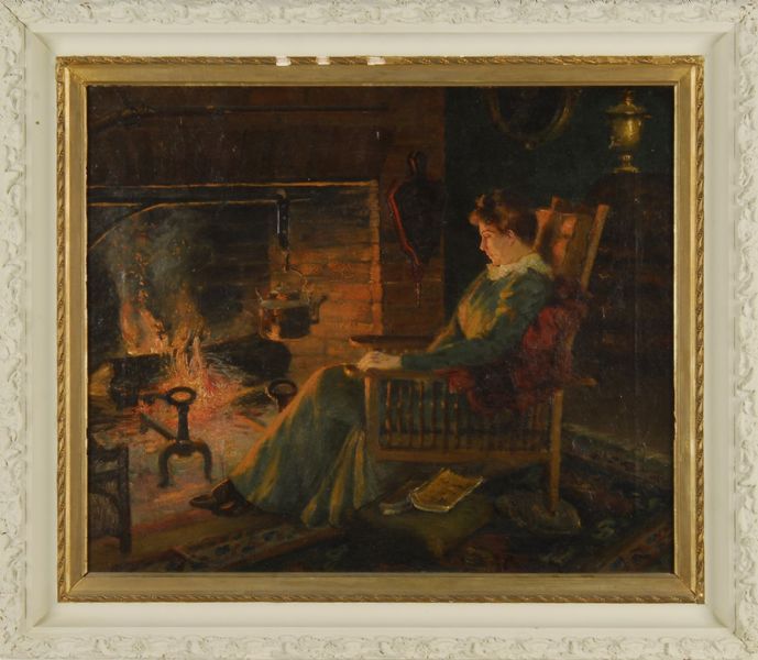 Interior scene with a woman seated by the fire