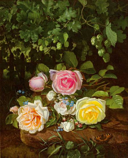 | Prachtvolles Stilleben mit bunten Rosen und Vergissmeinnicht am Waldboden vor Hopfendolden | |