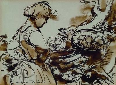 Frau mit Früchtekorb, lavierte Tuschzeichnung