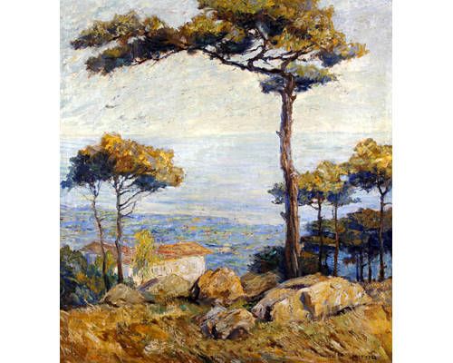 | Continental coastal landscape from a hillside overlooking trees and villa | |