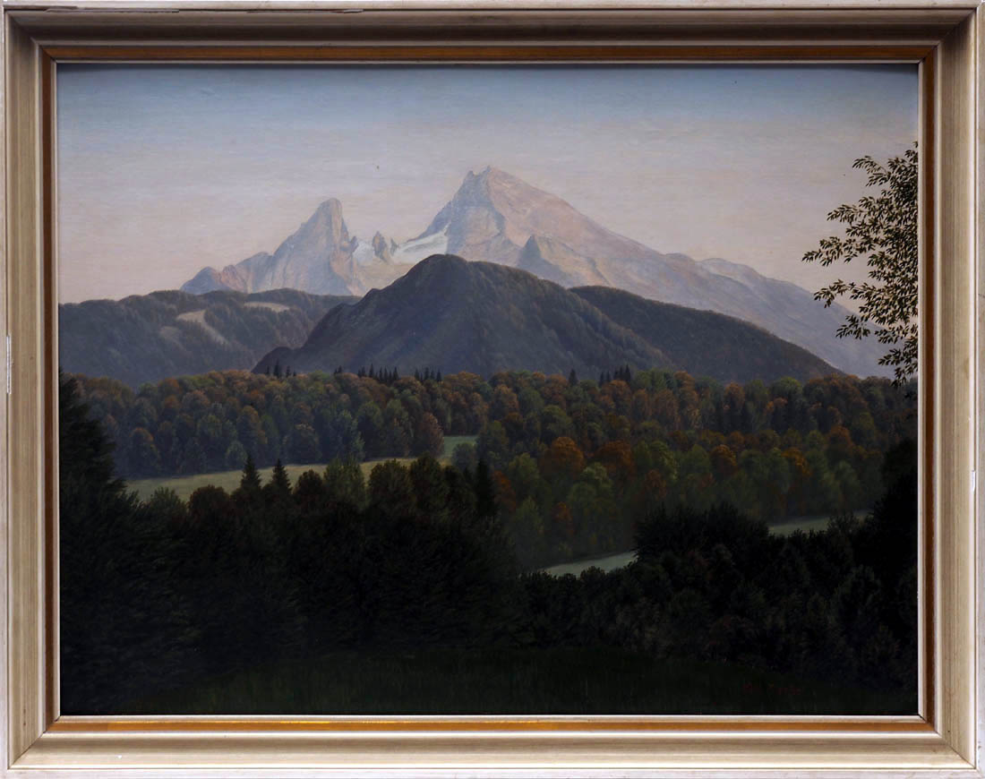 Summery alpine landscape with mixed forest, in the background the Watzmann