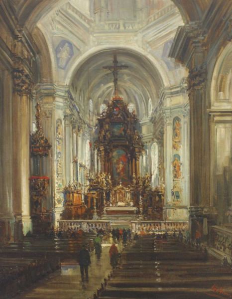 | Kircheninterieur der Pfarrkirche Stift Haug, Würzburg, mit reicher Figurenstaffage. | |