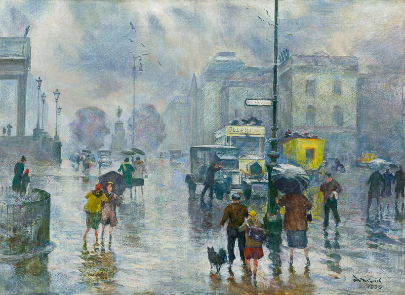 Regentag, Unter den Linden in Berlin. Eilige Passanten und Autodroschken. Auf Höhe des Opernhauses