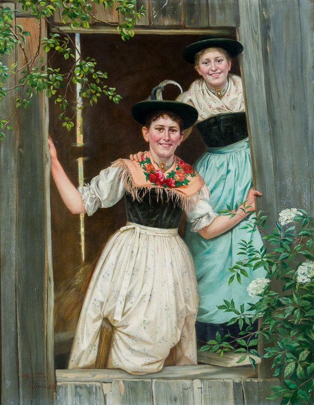 | Grüß Euch Gott. Zwei lächelnde Landmädchen in Schlierseer Tracht in Fensteröffnung des Stalls. Hüftbildnisse | |