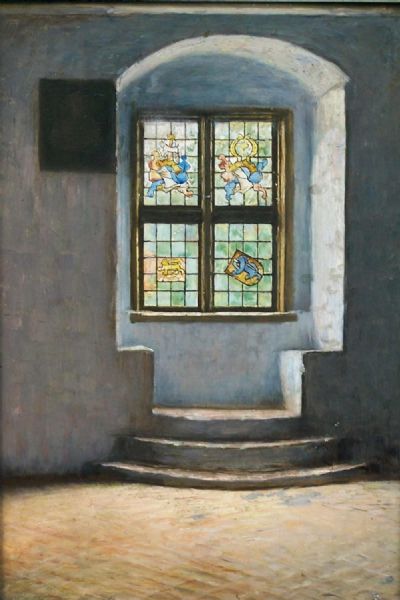 Bunte Glasfenster einer Burg.