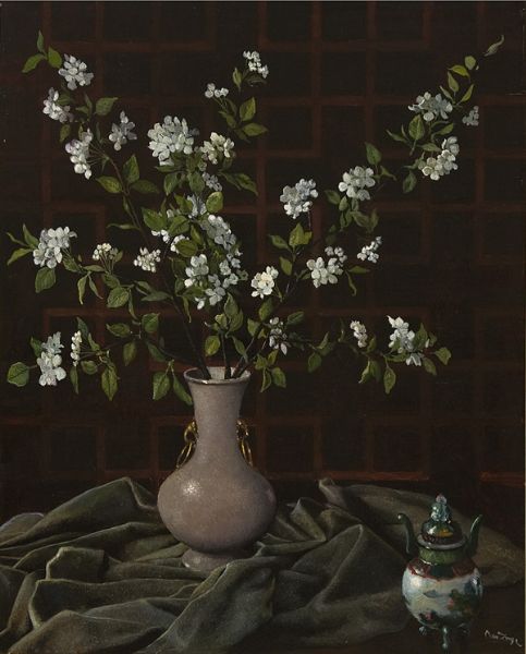 | Kinesiserande stilleben med blommande fruktkvistar i vas | |