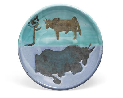 Partially glazed white earthenware turned plate, painted in blue, green and black, from the edition of 500, with the 'Madoura Plein Feu' and 'Edition Picasso' stamps.