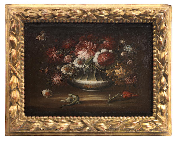 | Chrysanthemums, narcissi, poppies and other flowers in a silver gilt urn on a table-top with a lizard in a carved and gilt wood | |
