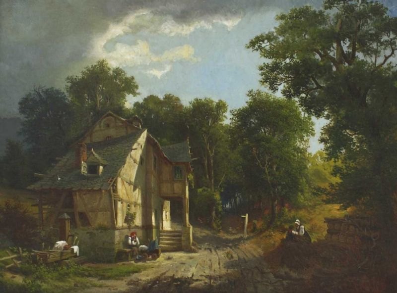 Sommerlandschaft mit Fachwerkhaus am Weg und Personen.