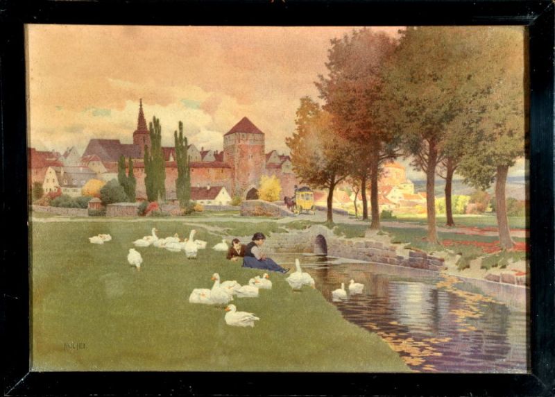 Vor dem Städtchen - Gänse und zwei Kinder am Bach