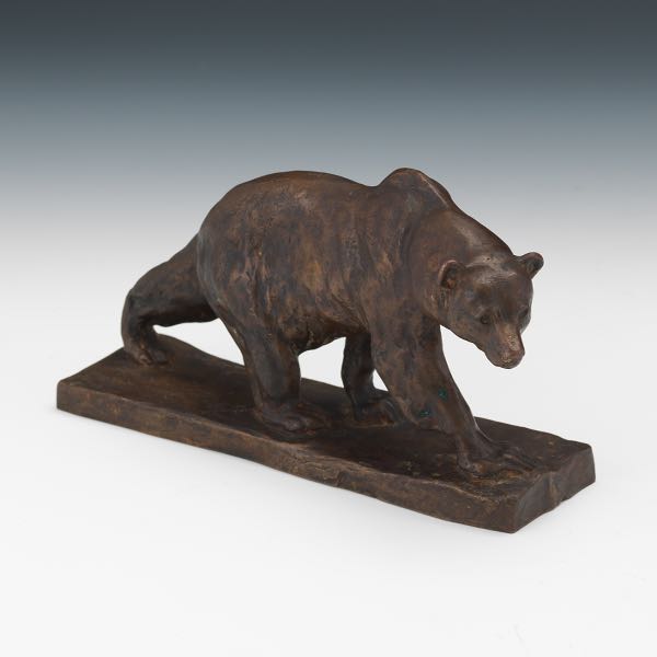 | Bronze sculpture with warm brown patina of a walking bear on a rectangular base | |