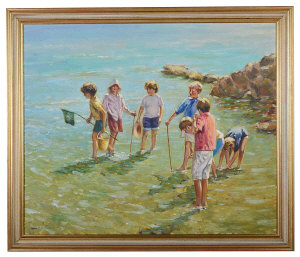 Children paddling in a coastal landscape