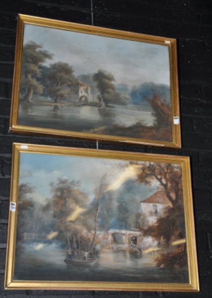Fishermen in a boat before a watermill, and figures at the same watermill