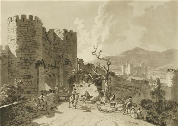 Harlech Castle in Merionethshire with Snowdon at a distance