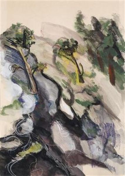 | Mixed Media with gouache on paper, laid down on cardboard, framed | |