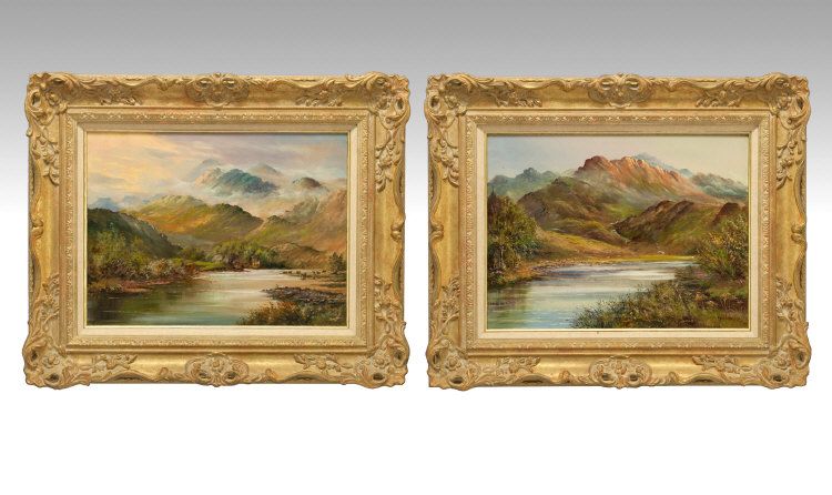 Pair Of Oil On Canvas 'River Scenes With Cattle And Sheep Mountain Backdrop'