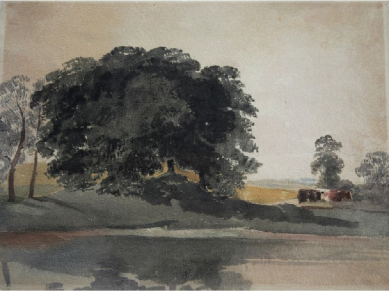LANDSCAPE SCENE WITH CATTLE AND TREES BY A POOL