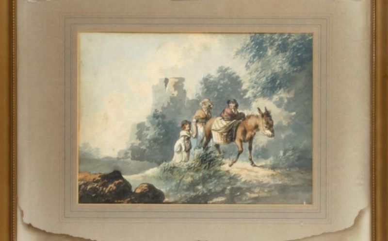 | Travellers and donkey on a Country Lane, together with Mary A. Hull Still life of plums on a bank | |