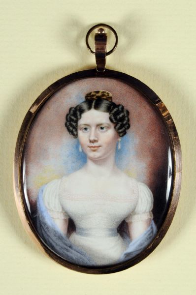 | oval portrait miniature of a young lady, named J. Wiseman, in delicate white lace trimmed dress, with pale blue shawl and pearl | |