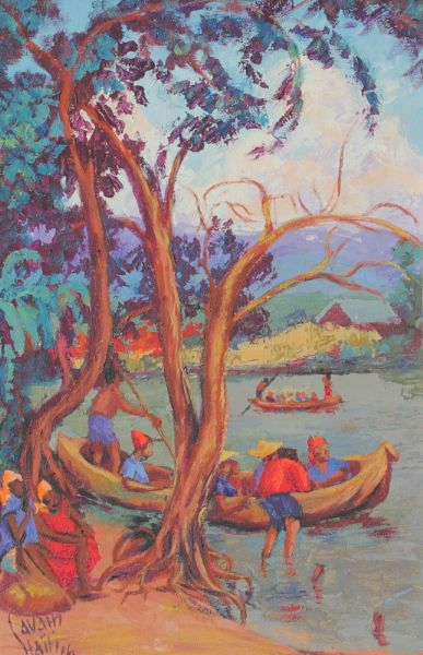 Haitian Painting with Figures in Boats and on the Shore of a River