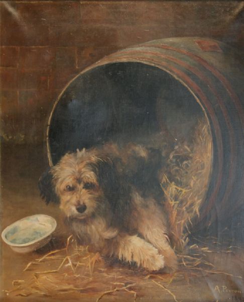Study of a Dog in an Overturned Barrel beside a Dish of Water