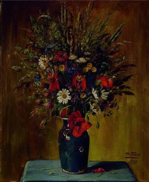 Stilleben mit Wiesenblumen in bemalter Keramikvase