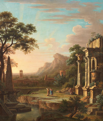 A river landscape with figures conversing before ruins