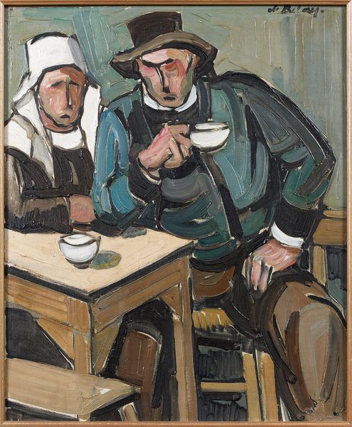 COUPLE DE BRETONS BUVANT DU CIDRE