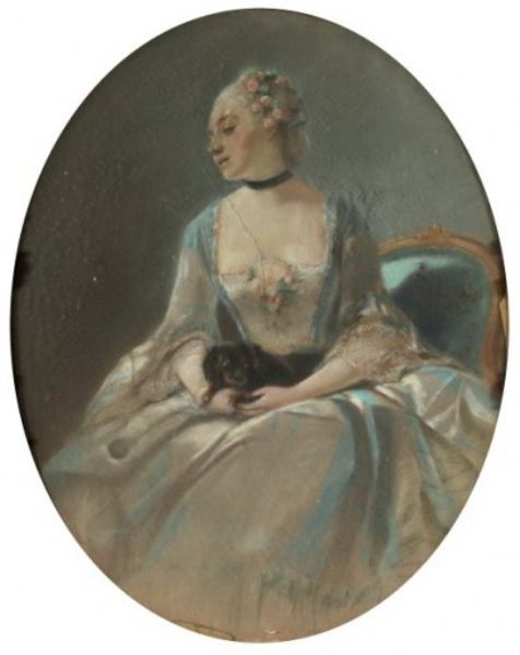 | Portrait de femme sous le règne de Louis XVI assise avec son petit chien | |