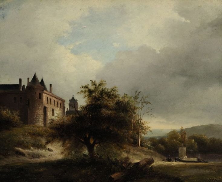 Landschaft mit Burg an einem Fluss