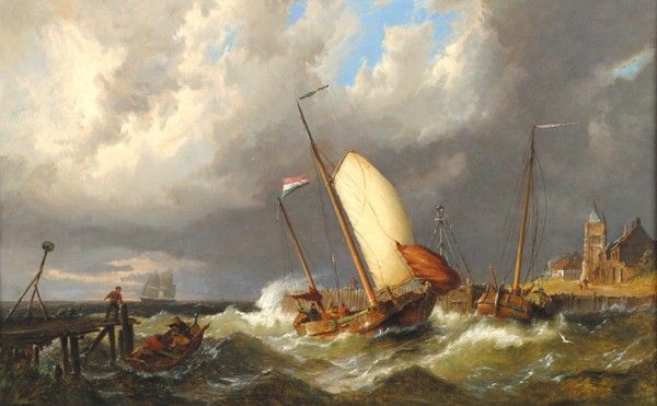 Schepen voor de kust bij stormachtig weer. Rechts een