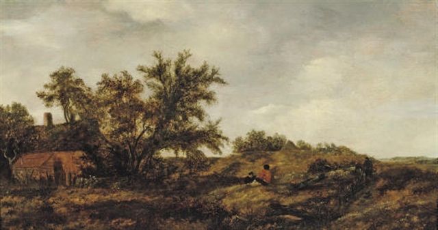 | An extensive dune landscape with figures resting, a cottage nearby | |