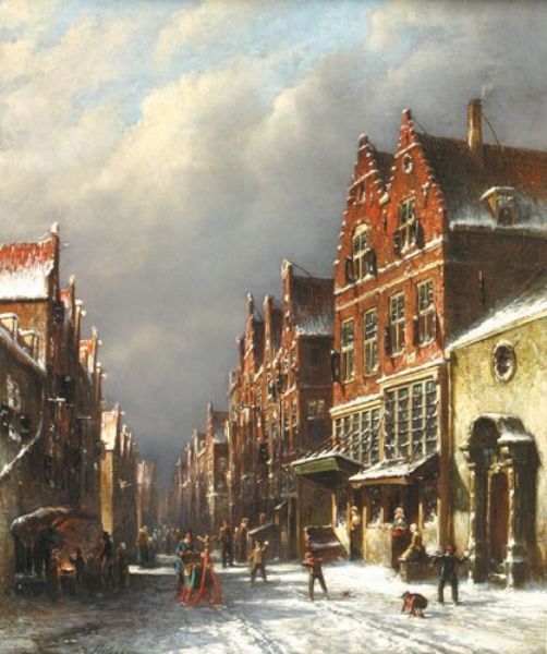 Winters stadsgezicht met figuren