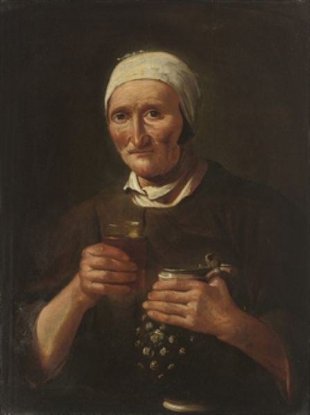 Portrait of an old lady, a pitcher in her left hand, a glass in her right