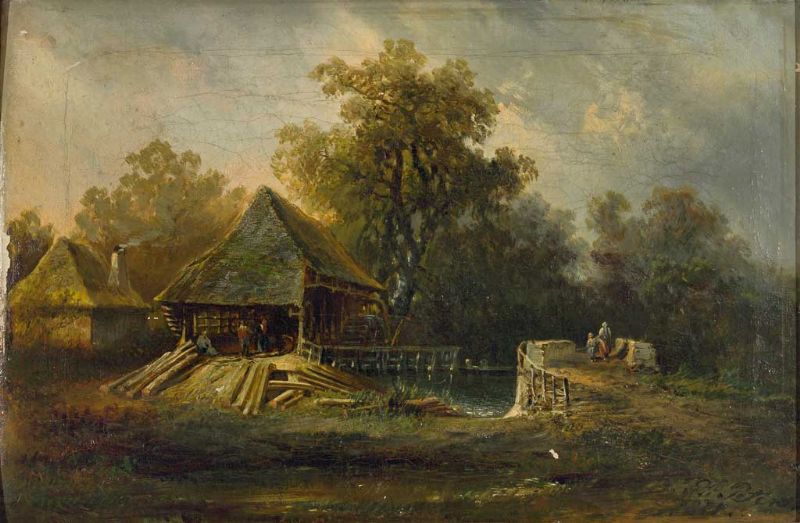 Sommerlandschaft mit Sägewerk, Bachlauf und Brücke.