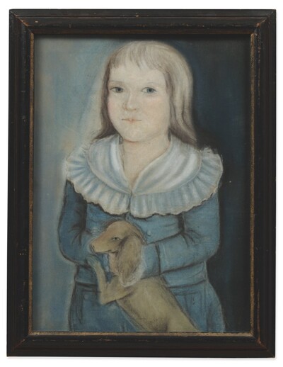 | PORTRAIT OF A BLONDE HAIRED YOUNG BOY IN A BLUE SUIT WITH WHITE RUFFLED COLLAR EMBRACING HIS PET DOG | |