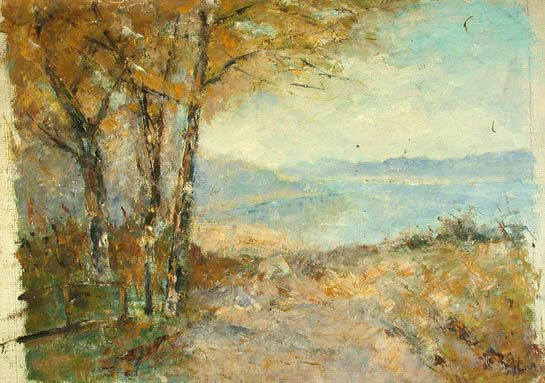 Seelandschaft im Herbst. Im rechten Bildvordergrund Laubwald mit einer kleinen Brücke.
