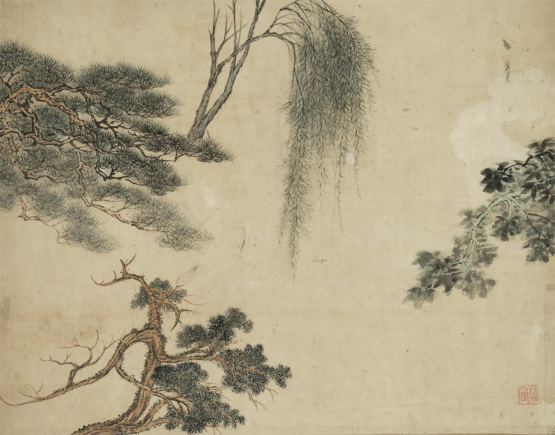 | Représentant des branches d'arbres: saule pleureur, pin, cyprès et platane | |