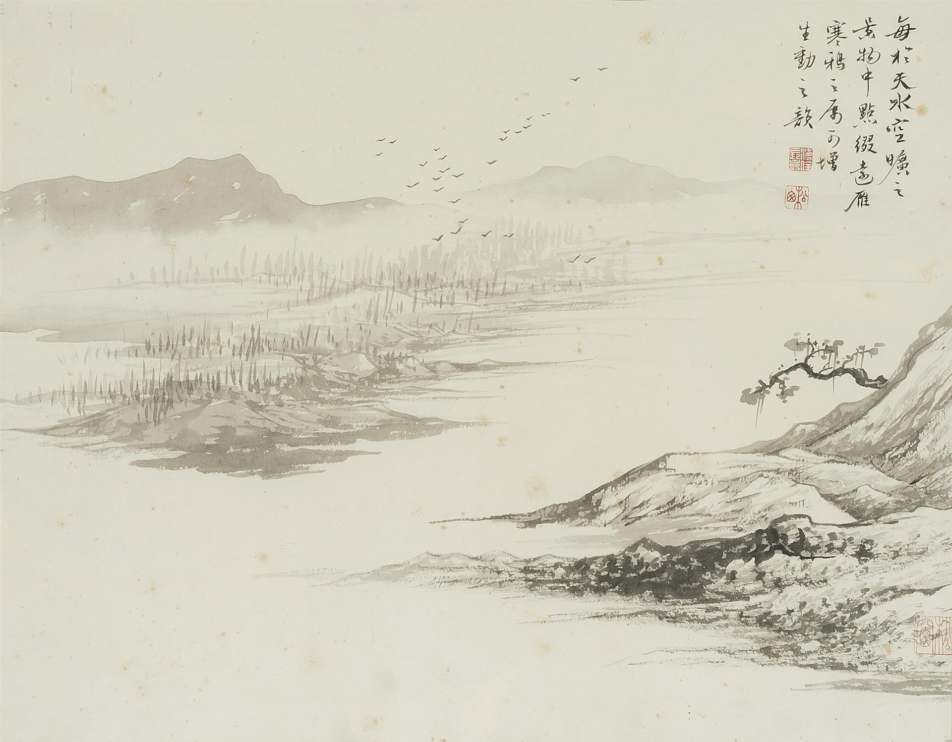 Représentant des oiseaux survolant un paysage lacustre dans la brume