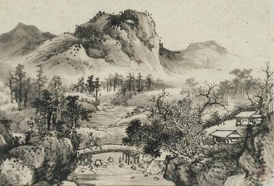| représentant un lettré traversant un pont dans un paysage montagneux | |