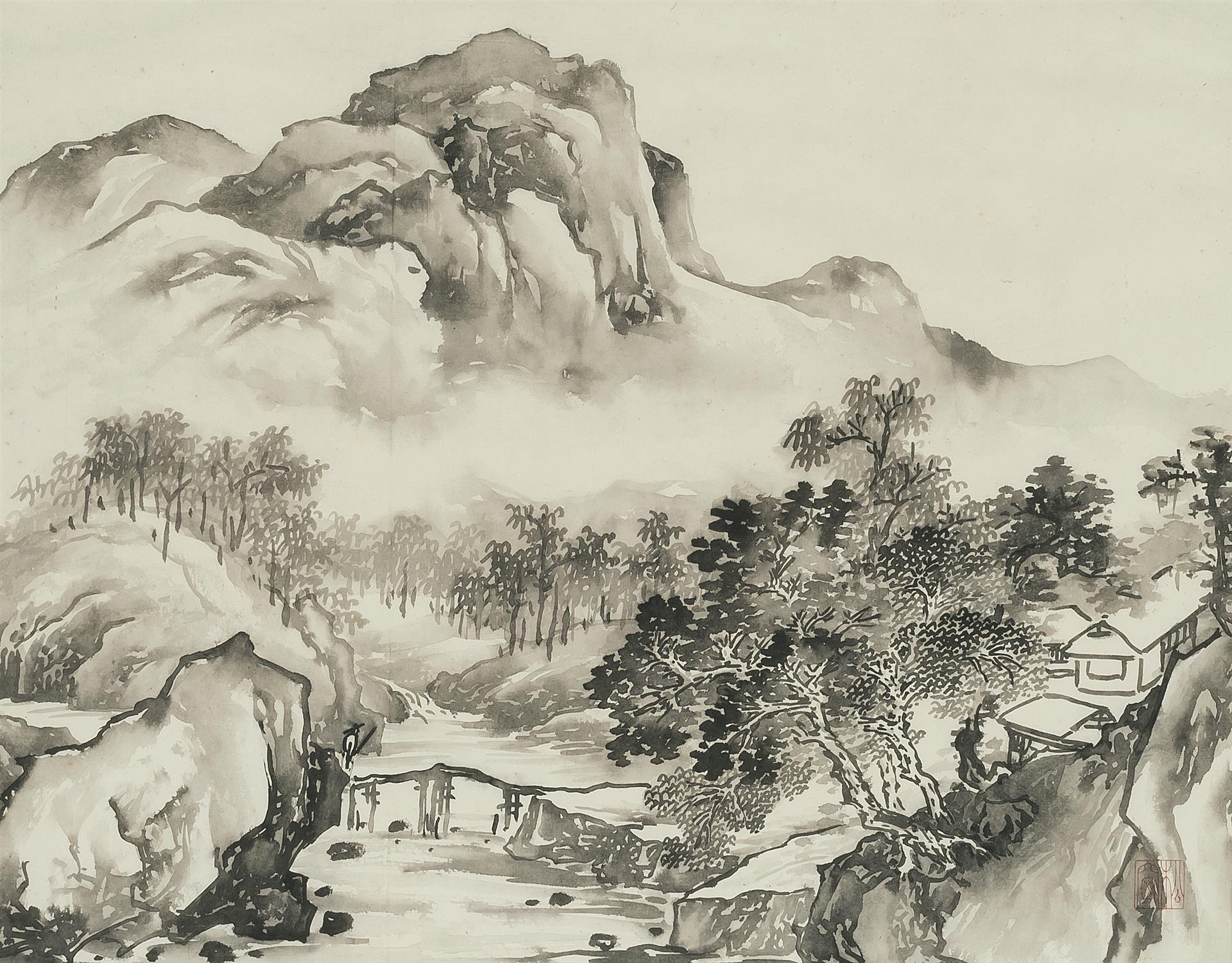 Représentant un lettré traversant un pont dans un paysage montagneux embrumé