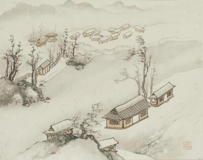 | représentant un village enneigé dans un paysage montagneux | |